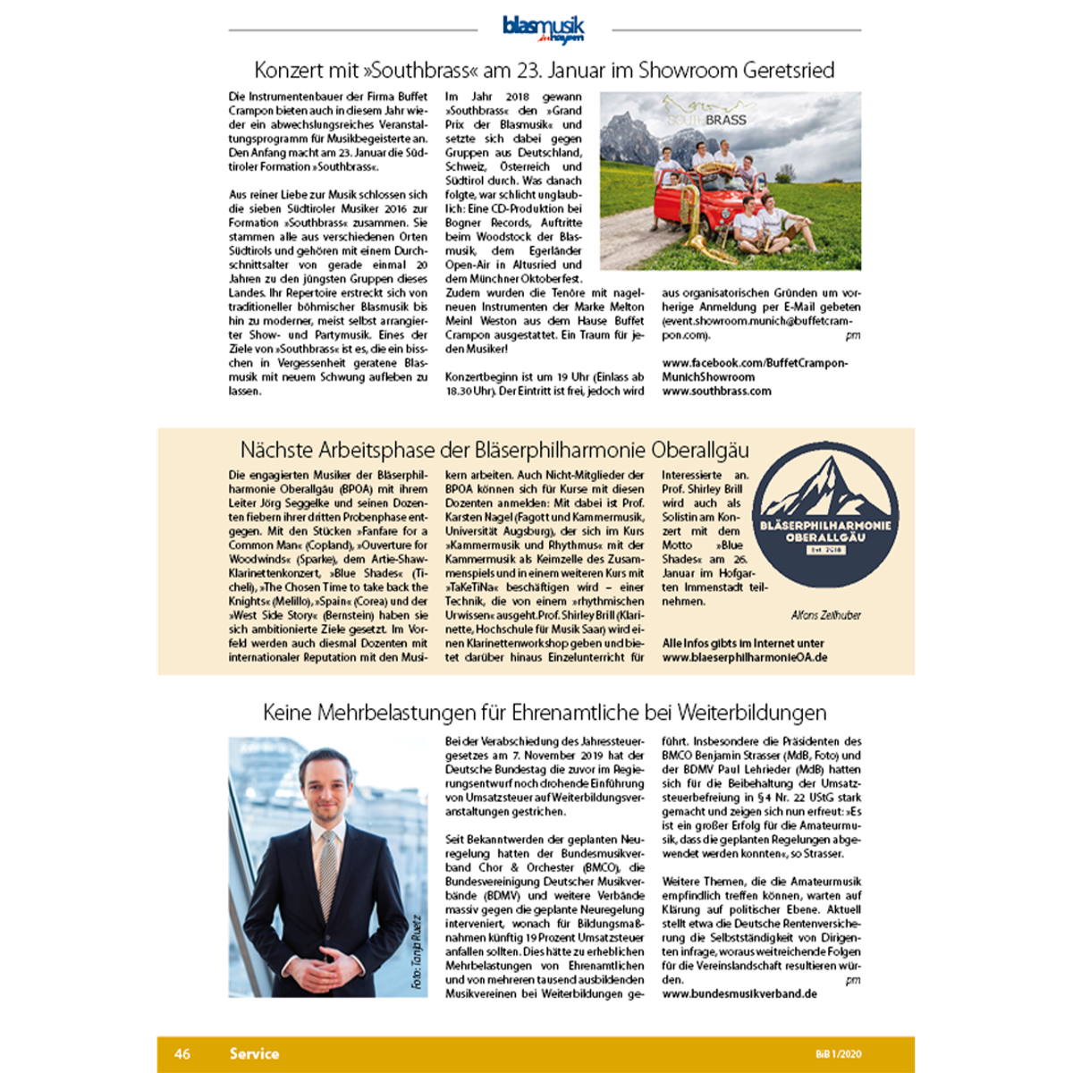 Die „Blasmusik in Bayern“ ist dabei nicht nur die Informationsplattform für die Verbände, auf der sie vor allem mit der Digitalausgabe ihre Vereine und Musiker ganz direkt erreichen können. Vielmehr bietet das Magazin in der Online-Ausgabe auch allen bayerischen Musikkapellen und -vereinen die Möglichkeit, die Blasmusikfamilie über ihre Aktivitäten zu informieren. Konzertberichte, Kapellenporträts, Fotos von Musikerhochzeiten oder Orchesterreisen haben in der „Blasmusik in Bayern“ ebenso ihren Platz wie Berichte über die großen Wettbewerbe der Verbände oder über deren politischen Bemühungen.